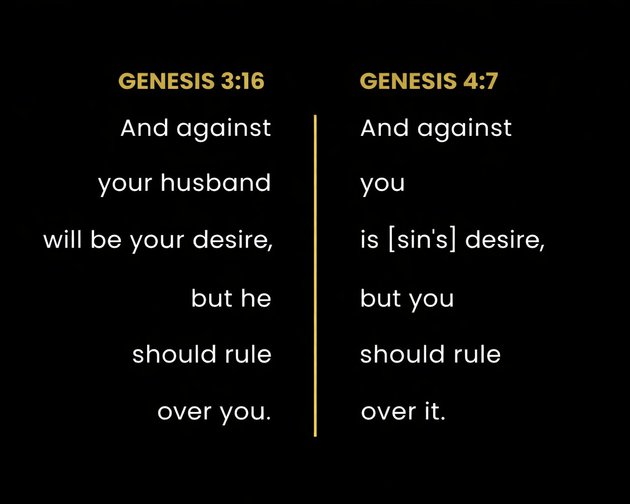 Genesis 3:16 in particular introduces relational tension within marriage. When it says, “Your desire will be for your husband, and he will rule over you,” the language points to a distortion of the partnership originally designed in creation. The word translated “desire” carries the sense of turning against or seeking to control—an idea echoed in Genesis 4:7, where sin’s “desire” is described as crouching at the door, seeking to overtake. In the same way, the woman’s desire in the context of the fall reflects a tendency toward resistance, opposition, or striving against her husband rather than alongside him. Likewise, the phrase “he will rule over you” reflects not loving leadership but a bent toward domination or control. Together, these reveal a relational dynamic distorted by sin where the wife may move toward resistance or antagonism, and the husband toward either passive withdrawal—like Adam in the garden, who stood by silently and then shifted blame—or toward harsh domination. These are corruptions of the original design that fracture unity and turn partners into opponents rather than co-laborers in cultivation.